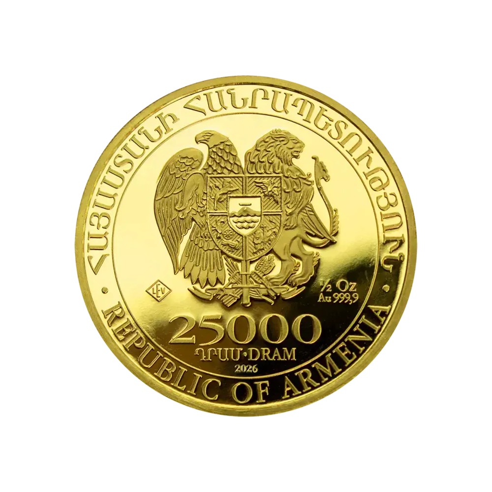 Op de voorzijde van de munt vind je het wapen van Armenië. Ook vind je hier het gewicht van de munt, de nominale waarde en het percentage aan goud wat erin verwerkt zit. Onderaan zie je het jaar waarin de munt geslagen is en de tekst 'REPUBLIC OF ARMENIA'.