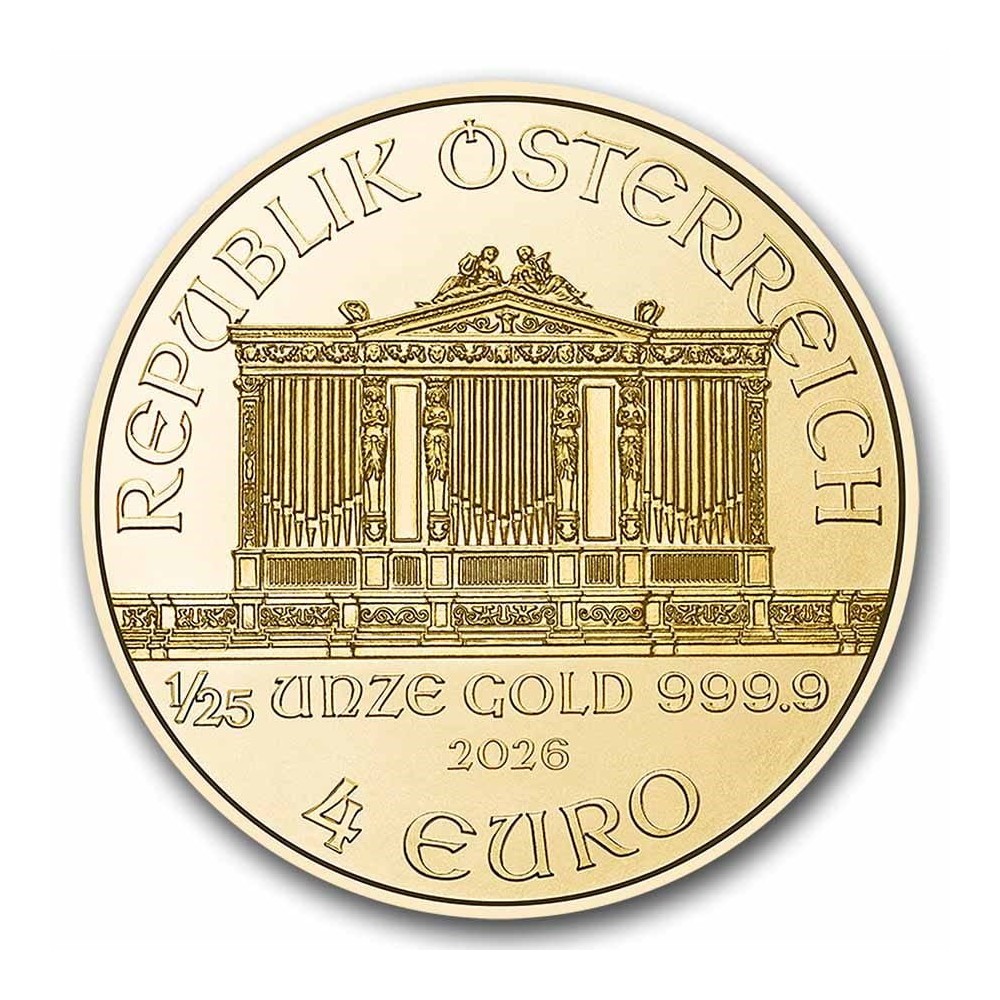 Op de keerzijde van de Philharmoniker pronkt het beroemde orgel uit de ‘Gouden Zaal’ van het concertgebouw in Wenen. Met daaromheen REPUBLIK ÖSTERREICH, 4 EURO en 1/25 UNZE GOLD 999,9, met daaronder het jaartal 2026. Het ontwerp van de munt is van Thomas Pesendorfer.