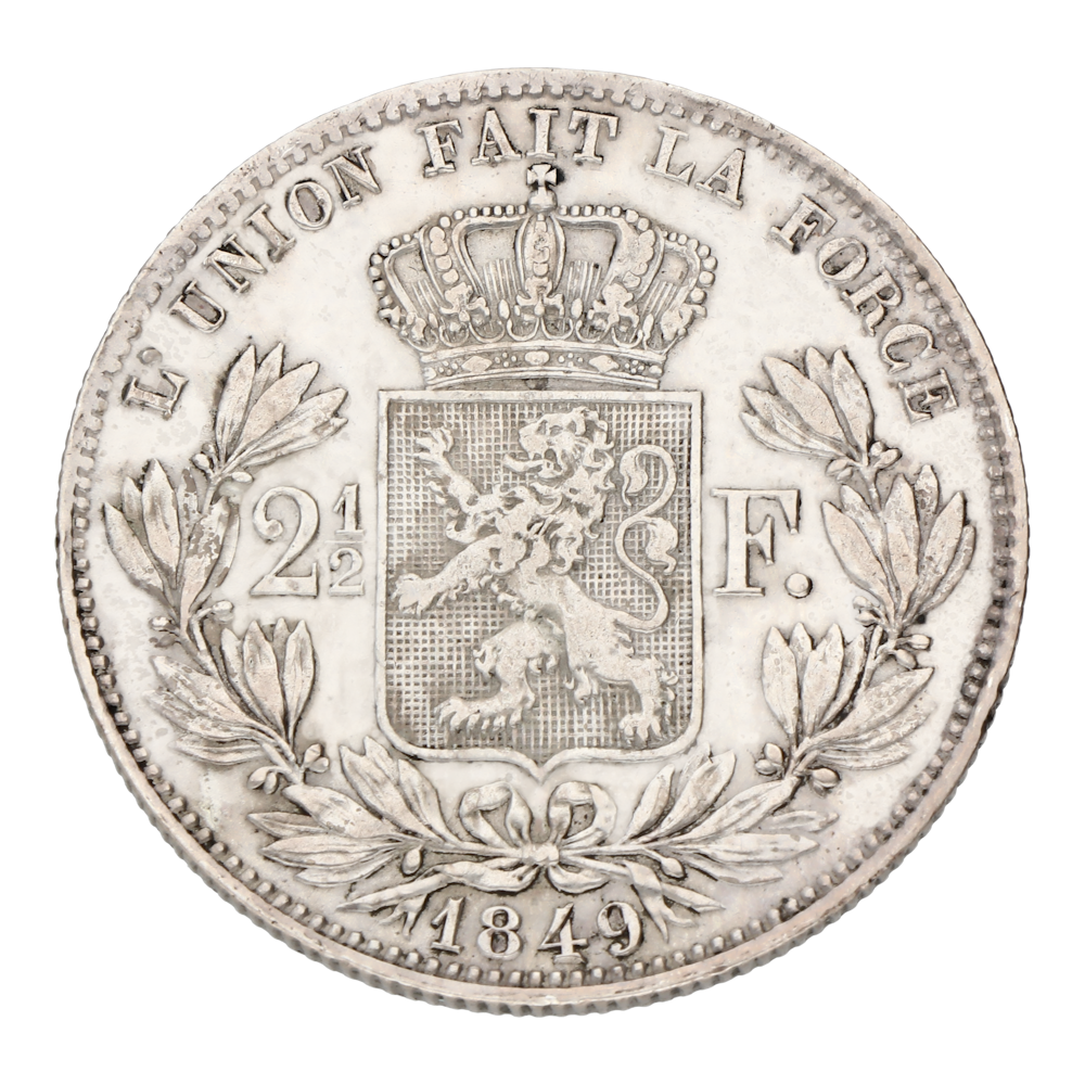 De 2½ Francs Léopold I werd geslagen in 1848 en 1849, in een tijd waarin België zich langzaam maar zeker vestigde als een stabiel koninkrijk. Enkele jaren na de Belgische onafhankelijkheid was de politieke orde hersteld en begon de economie zich te ontwikkelen. De munt met het zogenoemde Small Head-portret weerspiegelt die fase van groei en zelfvertrouwen — een periode waarin de jonge natie haar identiteit vormde en trots haar eigen muntstelsel uitbouwde.