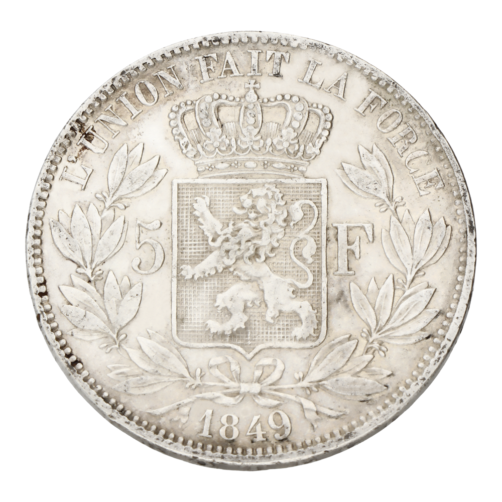 Deze munt werd geslagen tussen 1849 en 1865, in het bewind van koning Leopold I, de eerste koning der Belgen. Het was een periode van consolidatie voor het jonge koninkrijk, waarin politieke stabiliteit, economische ontwikkeling en de opbouw van nationale symbolen centraal stonden. De 5 Francs weerspiegelt die tijd en diende als een belangrijk betaalmiddel in het dagelijkse leven. Deze zilveren munt is een tastbare herinnering aan de groeiende identiteit en trots van België in de 19e eeuw.