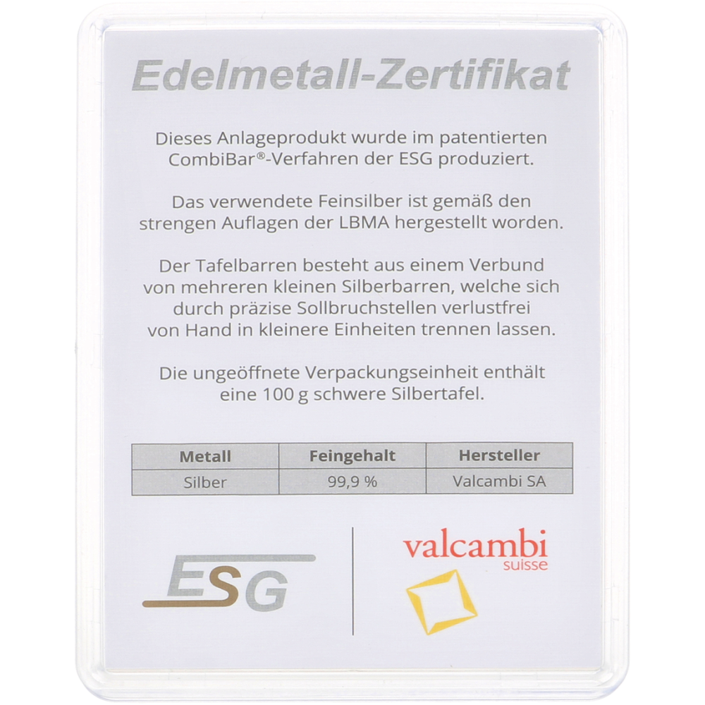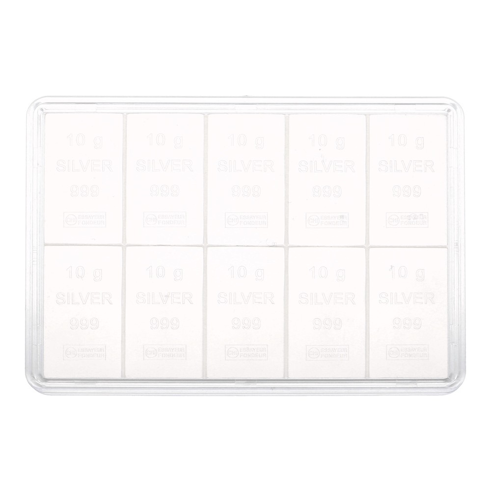 Wil je de Valcambi CombiBar met 10 zilverbaren van 10 gram kopen? Dan ben je bij Goudwisselkantoor aan het juiste adres. De Valcambi CombiBar bevat 10 zilverbaartjes van 10 gram zilver.