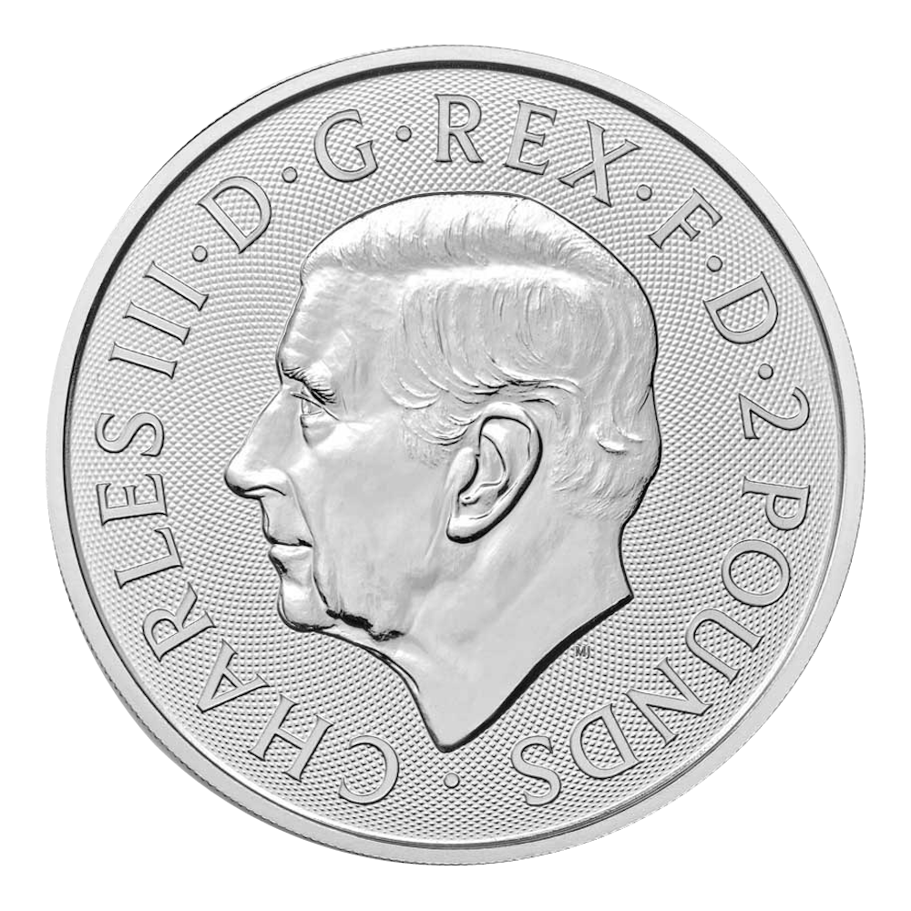 Op de achterzijde van de munt vind je het portret van Koning Charles III. Ook staat de nominale waarde van de munt op deze zijde, deze bedraagt 2 Engelse pond.
